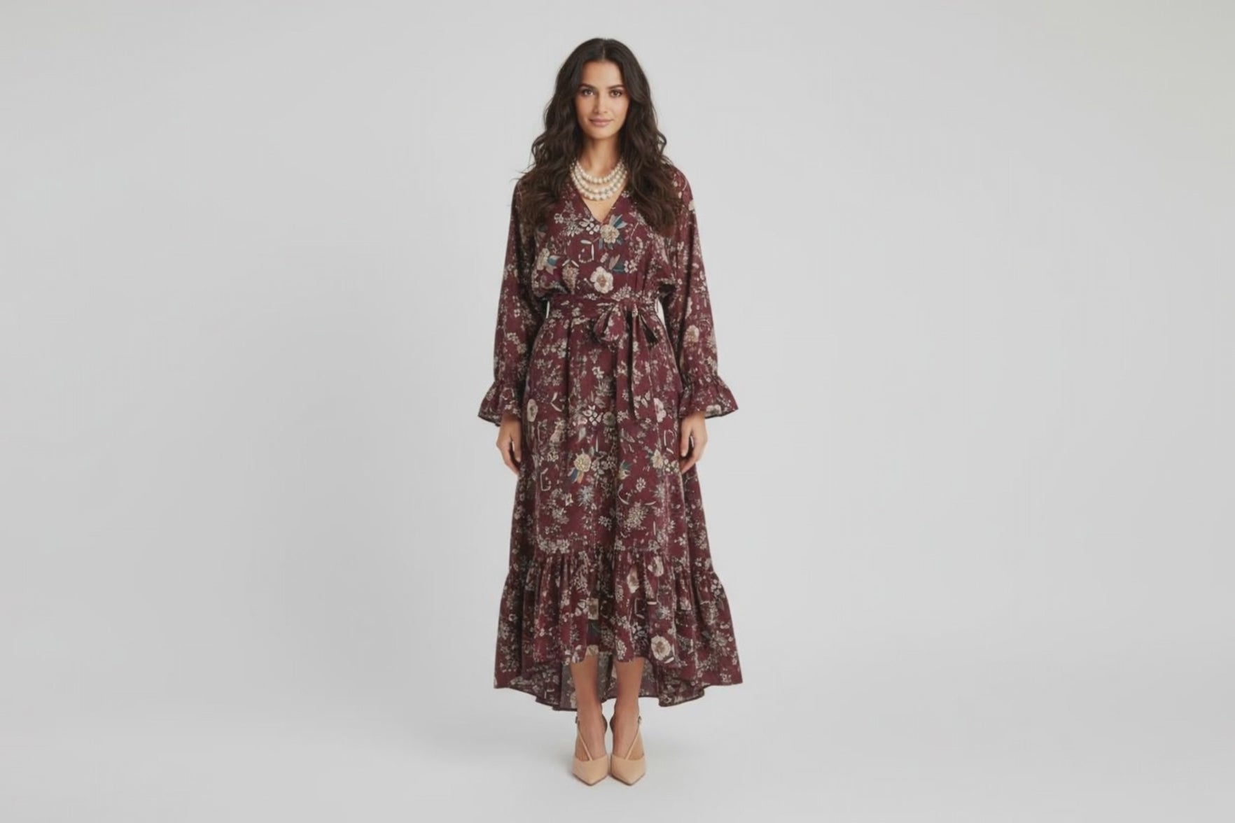 Romantic and refined, this floral-print dress is crafted from lightweight polyester with a soft drape. Featuring a flattering V-neckline, long sleeves with ruffled cuffs, and a tiered hemline with subtle volume, it cinches at the waist with a matching self-fabric belt for a feminine silhouette. The design includes an integrated slip dress for full coverage and comfort. Perfect for day-to-evening wear.