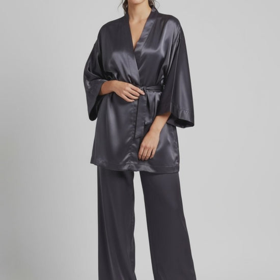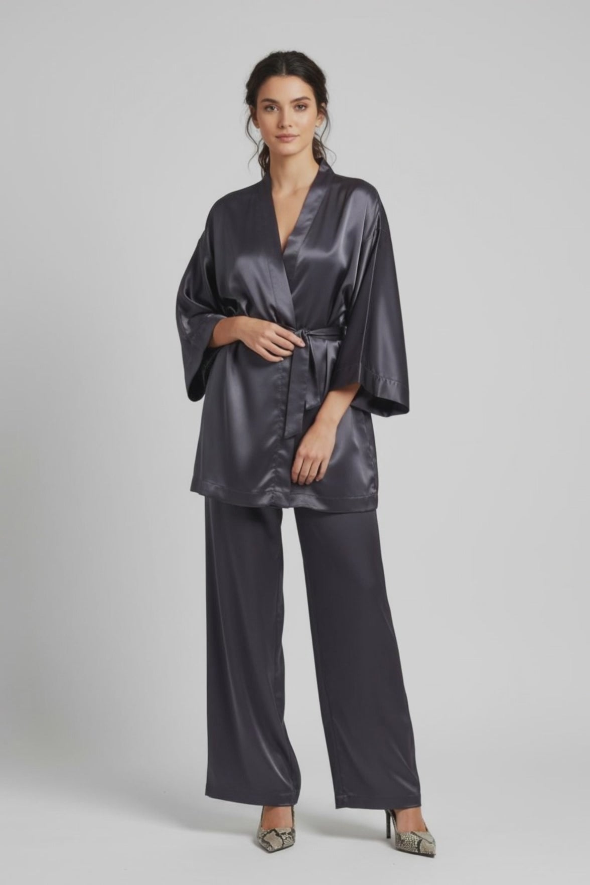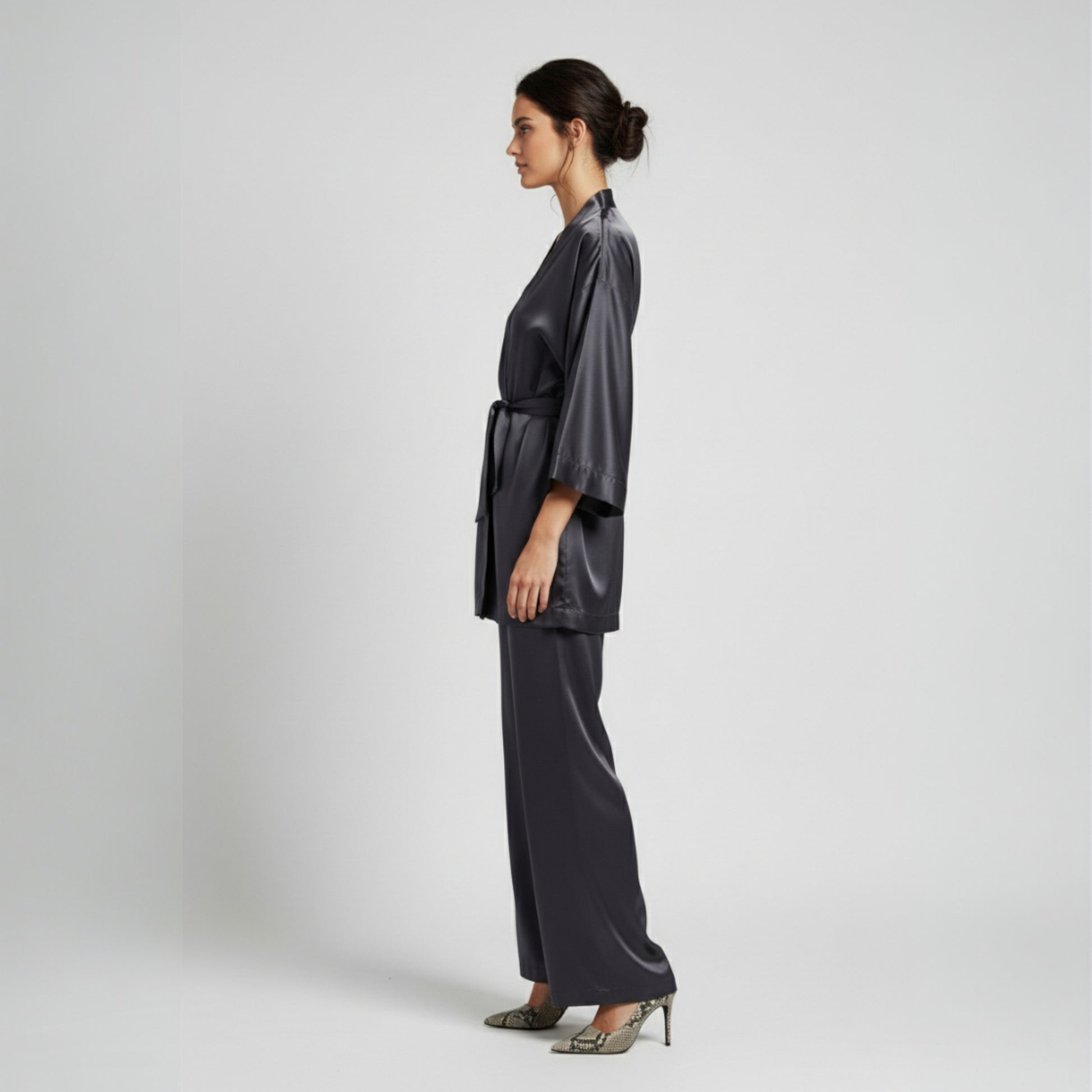 Refined and minimal, this kimono top is crafted from a satin-finish fabric that drapes beautifully on the body. Designed with wide sleeves, a relaxed silhouette, and a matching self-fabric belt to highlight the waist, it offers understated elegance with a modern edge. Perfect as a statement piece or paired with the coordinating trousers for a polished set.