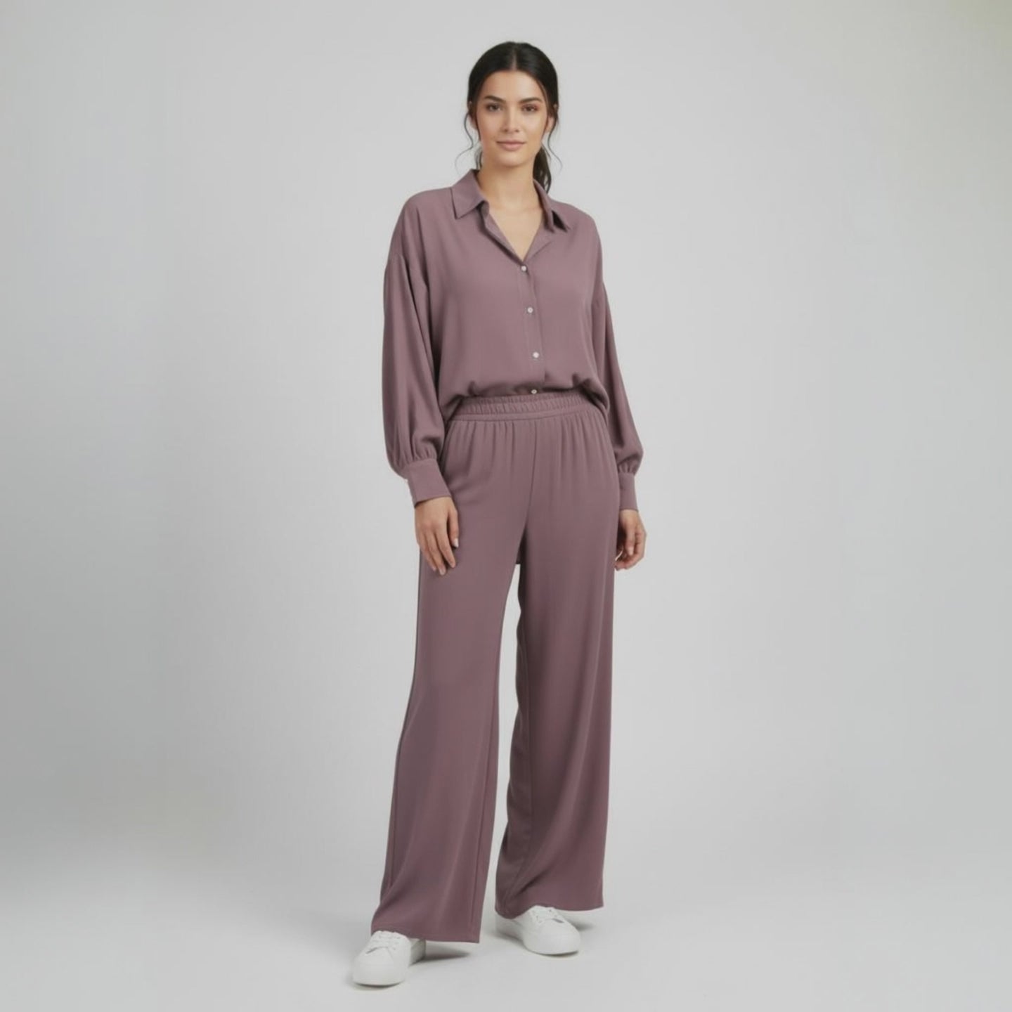 Effortless and versatile, these wide-leg trousers are designed in lightweight polyester muslin, giving them a fluid and elegant movement. The elastic waistband ensures comfort and flexibility, while the full-length silhouette elongates the figure. Ideal to pair with the matching shirt for a coordinated look, or styled separately for endless outfit possibilities.