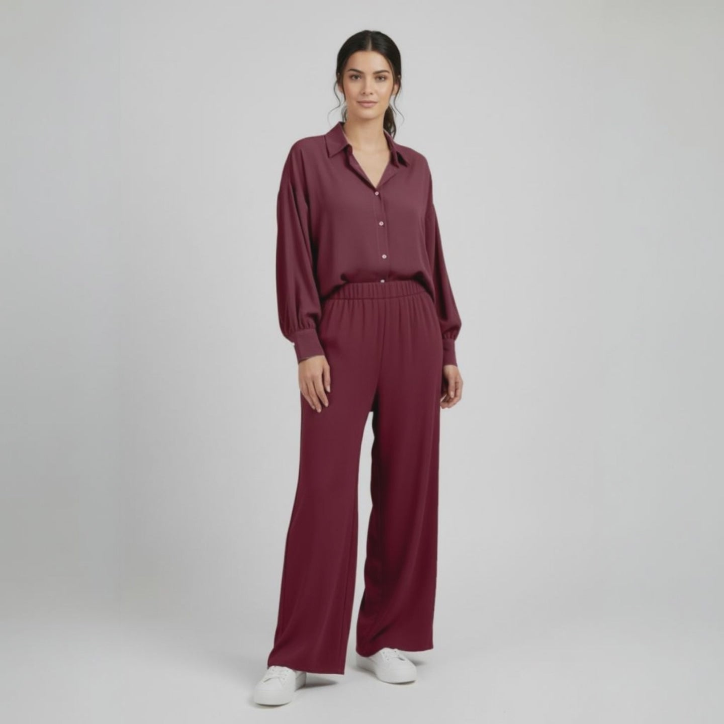 Effortless and versatile, these wide-leg trousers are designed in lightweight polyester muslin, giving them a fluid and elegant movement. The elastic waistband ensures comfort and flexibility, while the full-length silhouette elongates the figure. Ideal to pair with the matching shirt for a coordinated look, or styled separately for endless outfit possibilities.